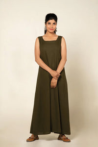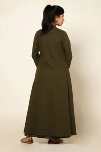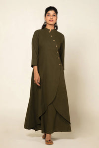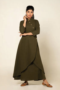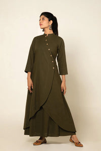 +Minimal yet effortlessly elegant, this army green co-ord set crafted in breathable linen slub, is a timeless essential. The asymmetric jacket styled kurta features wooden button detailing along a curved placket, three-quarter sleeves and a structured mandarin collar for a clean, contemporary look. Paired with a matching A-line long sleeveless inner, this ensemble blends minimalism with smart tailoring, ideal for workwear or casual chic days.