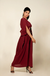+A striking ode to effortless elegance. Crafted in rich maroon toned linen slub, this relaxed jumpsuit features a flattering V-neckline, dramatic draped sleeves and a cinched waist with a textured jute belt like statement detailing. Designed for movement and flair, the flowy structure mimics a kaftan while offering the ease of a jumpsuit, making it your go-to piece for destination evenings, sundowner get-togethers or artistic escapes. It’s bold, breathable and beautifully bohemian.