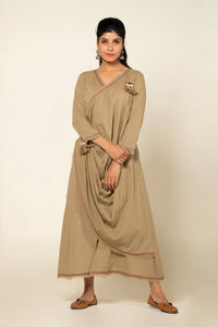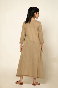 +Be admired for your distinct sense of fashion with this ankle length dress with several flowing gathers pinned and stitched carefully on one side, adding to the flounce of this summer dress. It has fringe and thread details running through the dress adding timeless charm enhanced with handcrafted raw jute patch work with shells and button details. It has been made using high-quality linen slub which makes it durable and easy to maintain.