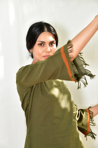 +A captivating outfit that blends natural tones with effortless style. The tunic comes in a army green tone crafted from lightweight linen slub, featuring a relaxed fit, classic round neckline and wide three fourth sleeves paired with boho pants. Bohemian fringe detailing along the hem and cuffs, accented with a subtle rust trim, adds playful texture and artisanal charm.