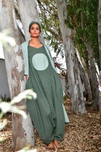 +Step into serenity with this jumpsuit where earthy elegance meets effortless flow. Crafted in soothing sage hues, this statement piece features a bold full-moon motif that grounds your spirit in calm. The soft relaxed dhoti style silhouette makes it perfect for laid-back days, creative wanderings and soulful escapes.