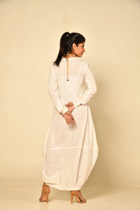 +Embrace effortless grace in this asymmetrical white balloon dress crafted from airy linen slub. With its unique gathered hem and layered detailing, it adds movement and modern flair to a timeless silhouette. Perfect for both elevated daywear and relaxed evenings.