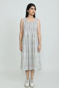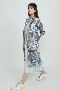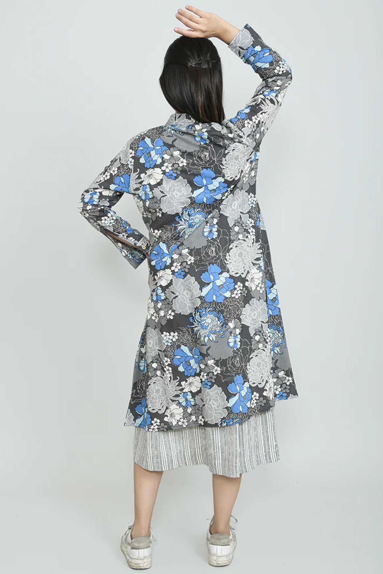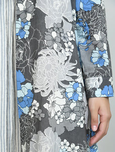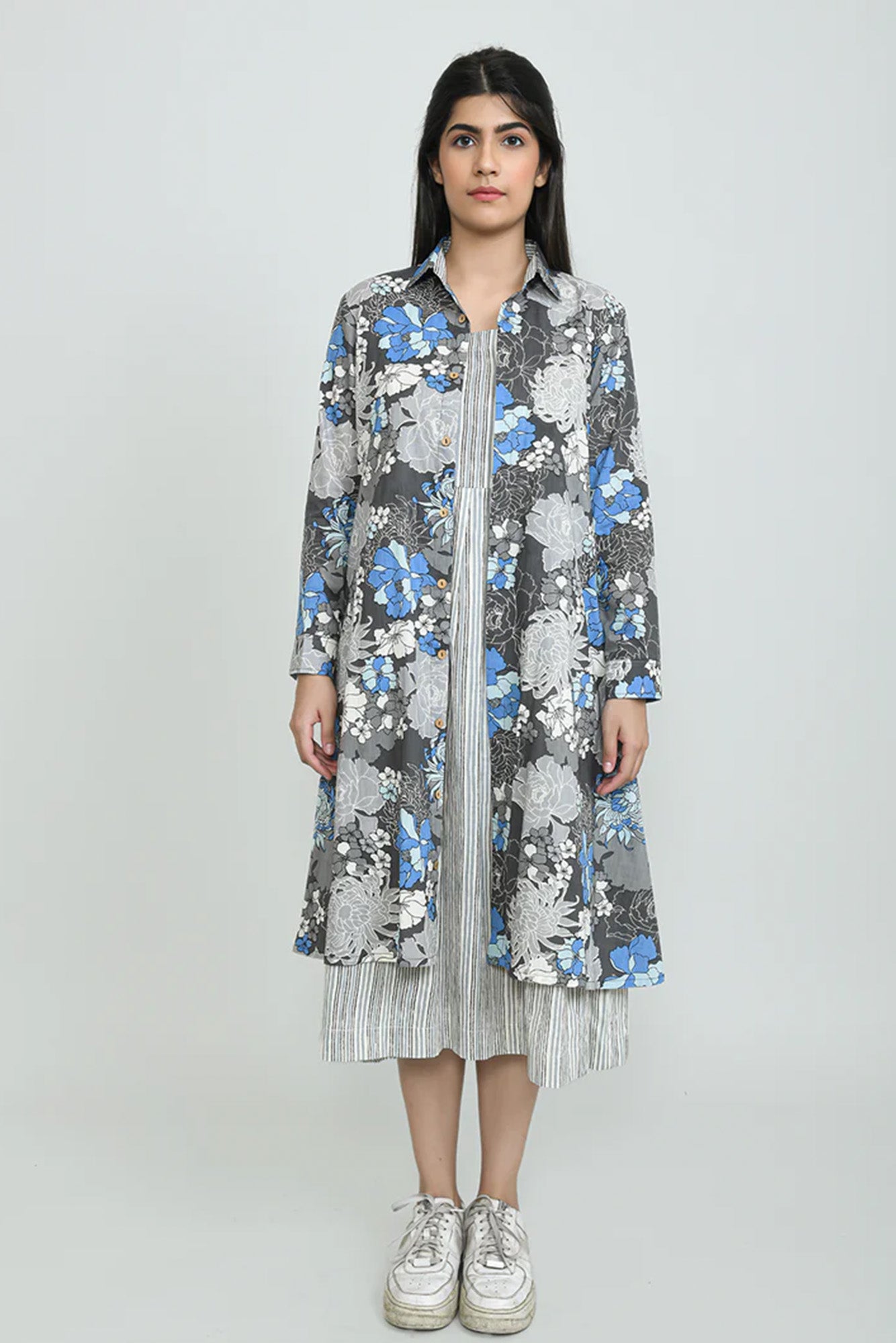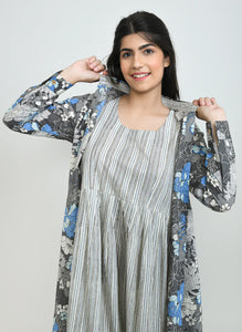 +This elegant two-piece set features a sophisticated grey and white striped sleeveless dress, perfectly layered with a flowing floral print overlay. The overlay showcases a captivating blend of blue, white and grey floral motifs against a grey background, designed with a classic collar and full sleeves. This versatile and stylish ensemble offers a contemporary look that effortlessly combines comfort with chic appeal, suitable for various occasions.