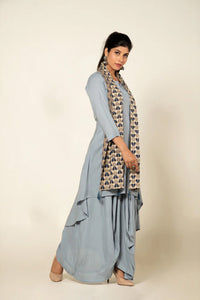 +Soft, fluid and beautifully double layered this dress blends structure with subtle drama. Made in soft sky blue shade, it features an asymmetrical drape. Perfect for daytime gatherings or laid-back festive styling.