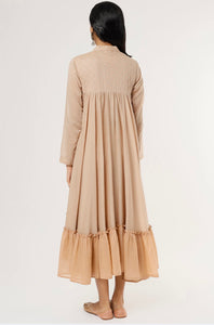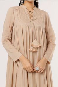 +Light as air and full of charm, the East Wind Dress captures the spirit of calm summer days. Crafted from breathable mulmul, it features a soft beige body with a breezy light peach contrast hem. The pleated yoke with keyhole detail, full sleeves and gathered flare give it an elegant, relaxed silhouette. Finished with a handcrafted tassel for subtle detail.