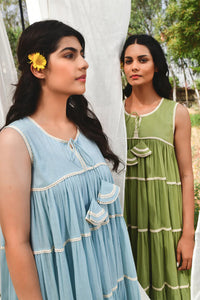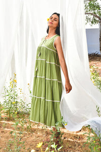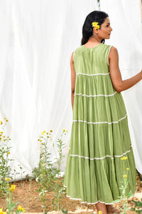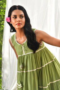 +A soft moss green mulmul dress for breathable, all-day comfort. This sleeveless, tiered midi dress features delicate white lace detailing across each tier, a round neckline with a keyhole tie, and handmade tassels for a playful finish. Perfect for garden strolls, weekend brunches or laid-back summer outings.