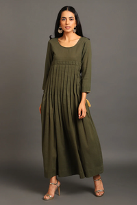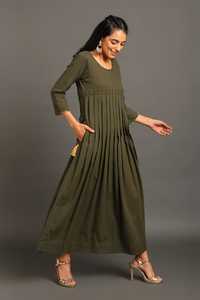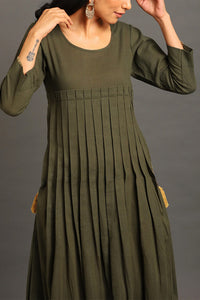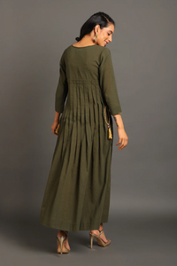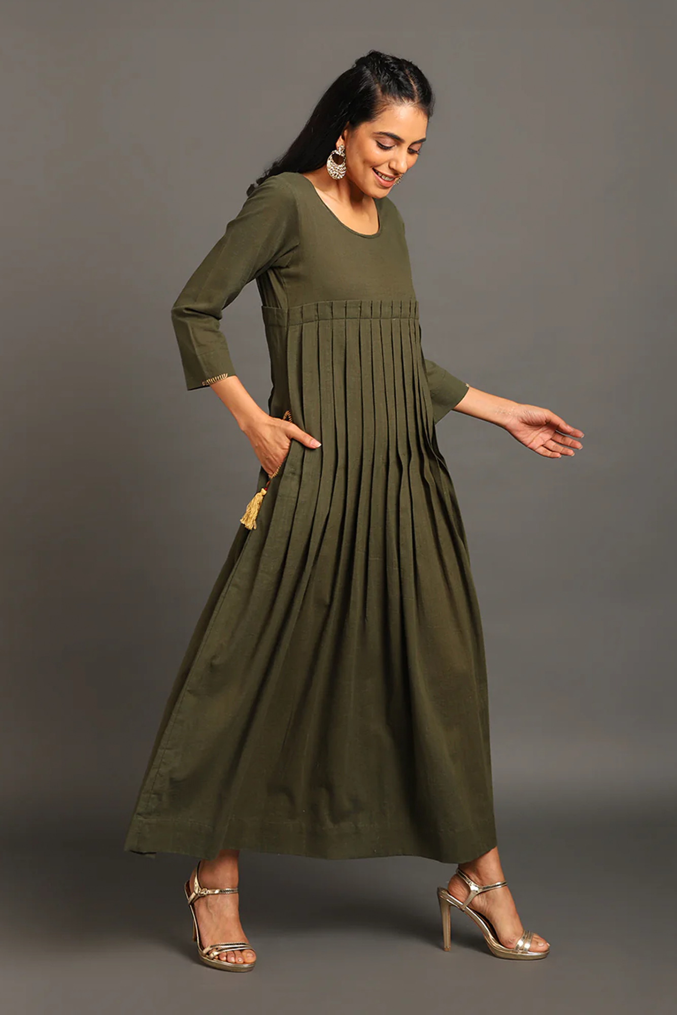 +Crafted in rich olive green linen slub, this maxi dress features structured knife pleats from the bodice downward, creating a sleek and flattering silhouette. The round neckline and three-quarter sleeves add elegance, while delicate thread tassels at the side bring a playful touch. A perfect fusion of comfort and refinement for daywear.