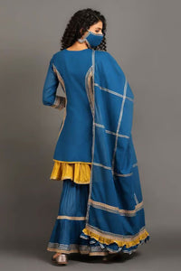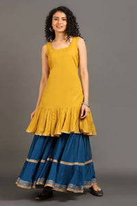 +Give your wardrobe a stylish lift with this kurta sharara set. Tailored to sartorial perfection from cotton mulmul, it assures a soft and soothing touch against the skin. The round neck adds to its appeal. Featuring three-fourth sleeves, it will surely impress your peers. The flowy tiered silhouette adds volume and movement, while the contrasting mustard yellow inner layering with gota detailed hem brightens the festive ensemble beautifully. Perfect for intimate gatherings and traditional celebrations.