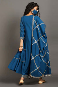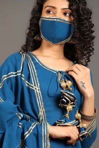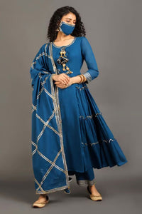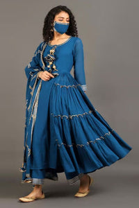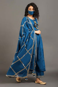 +Make a graceful statement with this elegant teal ethnic set, perfect for festive occasions and celebrations. The outfit features a flowy, side tiered kurta with delicate gold gota accents and detailing, giving it a regal charm. It includes a matching dupatta adorned with striking geometric patterns and tassel embellishments, adding movement and flair. Paired with coordinating straight pants featuring subtle gold detailing at the hem, this ensemble blends tradition with modern style. Ideal for pairing with juttis and statement jewelry for a complete festive look.