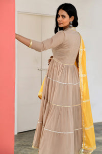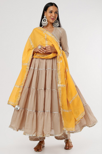 +This elegant outfit is crafted from soft and breathable mulmul, featuring a tiered beige anarkali kurta with subtle gota detailing. It’s paired with palazzo pants with gota detailing and a contrasting yellow dupatta for a pop of color. Lightweight and airy, this ensemble is perfect for summer festivities and daytime celebrations.