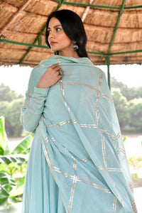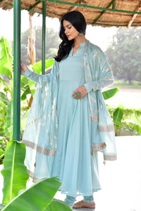 +Maintain a cut from the rest by wearing this long anarkali fully lined kurta, made in pure mulmul. The kurta is paired with a matching churidar and a sheer dupatta adorned with gota detailing in a geometric pattern. Minimalist yet festive, it’s ideal for daytime celebrations or intimate gatherings.