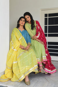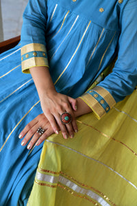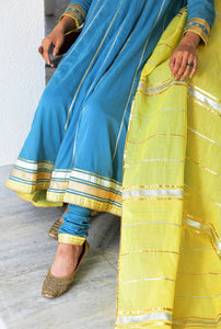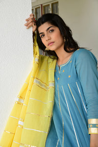+Brighten your ethnic wardrobe with this vibrant teal blue kurta set. Designed in pure mulmul, the flared kurta features vertical gota detailing and delicate golden embroidered motifs on the yoke, paired with three-fourth sleeves finished with gota lace cuffs. It is complemented by a lemon-yellow dupatta adorned with silver stripes and border work. A breezy, elegant pick for festive brunches and day celebrations.