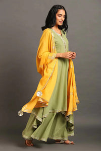 +Elevate your festive wardrobe with this olive green double layered dress featuring delicate gota work along the neckline, sleeves and hem. The dress is paired with a vibrant yellow dupatta with gota detailing adding a pop of color and festive charm to the ensemble. Perfect for intimate celebrations and day functions.