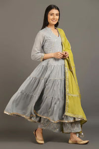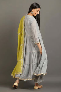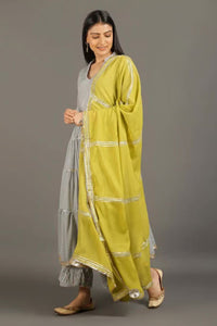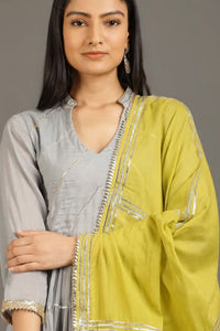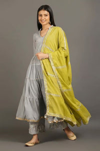 +Elevate your ethnic style with this refreshing sky grey kurta set, crafted in ultra-soft mulmul fabric. The flared, tiered silhouette offers graceful movement, enhanced by delicate gota detailing. The kurta features subtle diagonal stitch detailing and three-fourth sleeves for added charm. Paired with a matching palazzo and a contrasting lime green dupatta adorned with zari and gota accents, this set is perfect for festive mornings and elegant daywear. Breathable, lightweight and effortlessly beautiful.