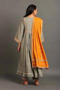 +Inspire chic finesse in your line-up with this exclusive kaftan inspired kurta with fine front and back gathers embellished with beautiful zari gota laces. It is paired with a relaxed fit ankle length pants. The look is complete in itself but to accentuate it further it comes with a mulmul dupatta in contrasting hues.