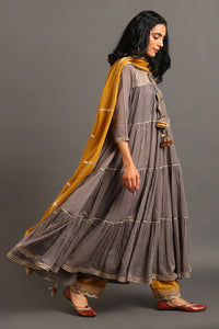 +Elevate your ethnic wardrobe with this elegant charcoal grey anarkali suit, featuring a finely pleated yoke adorned with delicate gota work and statement tassel ties. The flowy tiered silhouette adds volume and movement, while the contrasting mustard yellow dupatta with gota detailing and matching mustard pants with lace hem complete the festive ensemble beautifully. Perfect for intimate gatherings and traditional celebrations.
