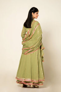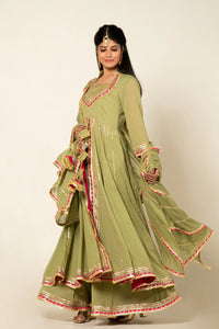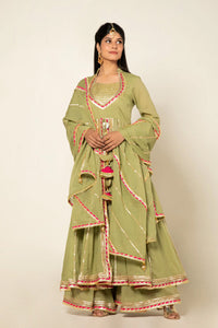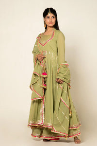 +Master the art of looking perfect with this beautiful green long anarkali kurta and sharara set with dupatta. The entire set is adorned with Gota lines and contrast magzi all over that speak for the intricate workmanship. A perfect pick for weddings, haldi mehndi ceremonies, pujas and festive soirées.