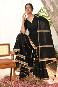 +Make a timeless statement with this elegant black sharara set. The V-neck kurta is adorned with intricate golden gota detailing on the neckline and hem, exuding understated sophistication. Paired with a tiered sharara featuring delicate gota trims and playful tassels, the set is completed with a sheer black dupatta showcasing symmetrical golden stripes and scalloped edges. Perfect for festive evenings and traditional gatherings, this look balances tradition with modern charm.