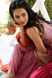 +Turn heads in this chic lavender and coral sharara set. The lavender kurta features a striped yoke with gota detailing and a delicate scalloped neckline, paired with a matching flared sharara embellished with golden trims and tassels on the sides. The vibrant coral dupatta with gold checkered gota lines and dainty tassels adds a bold contrast, making this ensemble perfect for festive celebrations and daytime functions.
