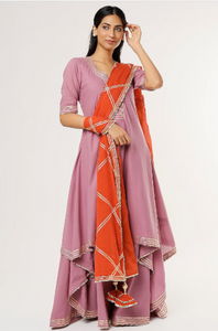 +Exude timeless grace in this lavender double layered set crafted from soft, breathable cotton. Featuring intricate gold gota detailing on the neckline, hem and contrasting vibrant dupatta with gota jaal and elegant tassels, this ensemble is perfect for festive occasions or intimate gatherings. A classic blend of tradition and elegance.