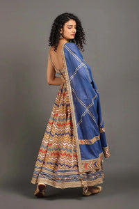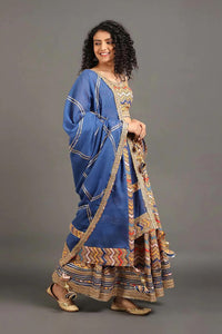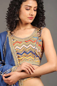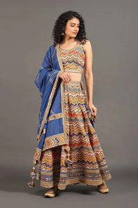 +Make a striking impression with this multicolour zigzag printed lehenga set, featuring a sleeveless scoop-neck blouse adorned with intricate gota detailing. The flared lehenga skirt is richly patterned with vibrant geometric motifs, complemented by a royal blue dupatta with golden gota stripes and printed borders. Perfect for festive occasions, this ensemble blends traditional elegance with a modern palette.