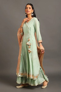 +Elevate your ethnic wardrobe with this soft mint mulmul kurta set, crafted for both elegance and comfort. Featuring a flattering wrap-style neckline with delicate gota lace detailing and handcrafted tassels, the flared kurta is paired with a voluminous gharara and a peach contrast dupatta. Perfect for festive mornings, intimate gatherings or daytime functions, this breathable cotton ensemble blends traditional aesthetics with effortless grace.