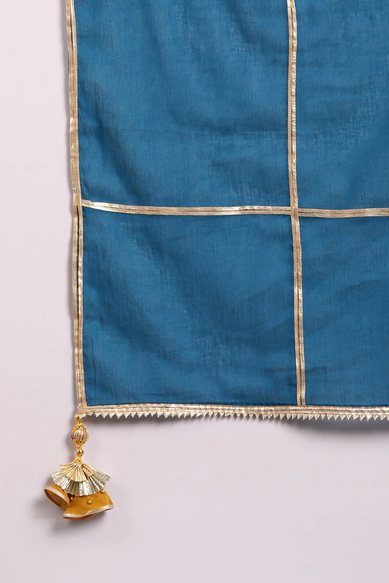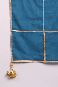 +Crafted in soft mulmul, this mustard Anarkali suit features intricate golden stripe detailing on the yoke and sleeve border. Paired with a contrast casa blue pants and dupatta adorned with gota zari laces and tassel accents, it brings together traditional charm with contemporary grace, perfect for festive occasions and elegant gatherings.