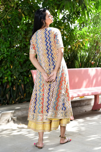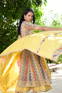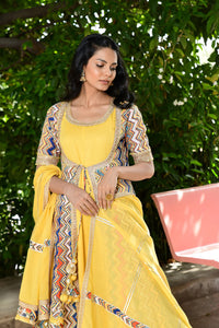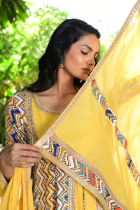 +Step into sunshine with this vibrant yellow anarkali set featuring a multicolor zigzag printed long jacket. The sleeveless anarkali dress inner is crafted from soft, flowy fabric and adorned with delicate sequin detailing along the neckline and hem. It showcases intricate gota detailing at the bottom, adding volume and festive flair. Completing the look is a matching yellow dupatta highlighted with coordinated zigzag printed panels finished with a shimmering gota border. This ensemble is perfect for festive celebrations, haldi functions or daytime weddings.