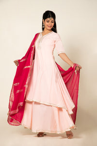 +Radiate subtle elegance in this soft pink double layered dress, paired with a contrasting bright rani pink dupatta. The dress features delicate gota work along the neckline, sleeves and hem of both the layers. Crafted in breathable cotton, this ensemble is perfect for intimate celebrations and daytime festivities.