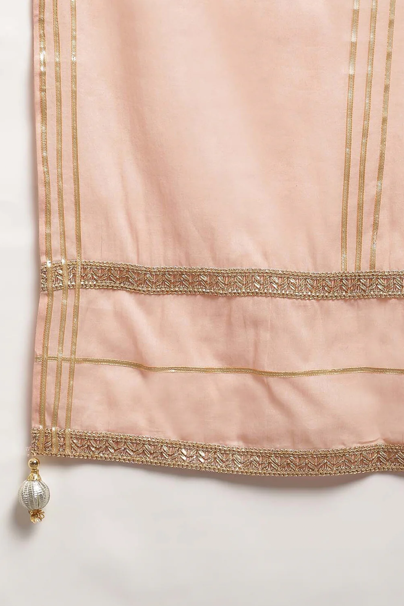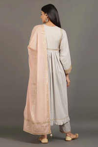 +Inspire chic finesse in your line-up with this exclusive kaftan inspired kurta with fine front and back gathers embellished with beautiful zari gota laces. It is paired with a relaxed fit ankle length pants. The look is complete in itself but to accentuate it further it comes with a mulmul dupatta in contrasting hues.
