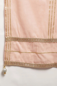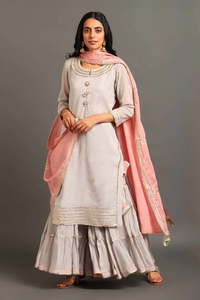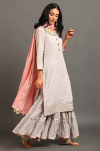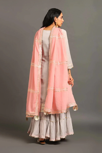 +Be the cynosure of all eyes in this beautiful mulmul sharara set. The straight kurta features intricate gota along the neckline and sleeves, offering a rich traditional finish. Paired with a flared tiered sharara and contrasting dupatta adorned with gota lines and laces, it exudes elegance and flair. Perfect for festive gatherings and cultural celebrations.