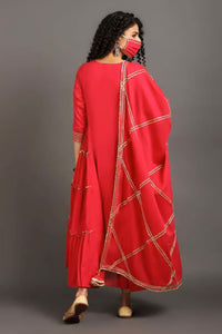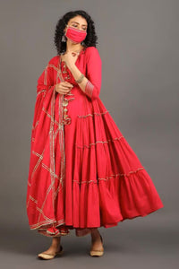 +Get ready to get compliments when you wear this suit with a beautifully handcrafted side-tiered kurta with playful gota latkans in the front. It is paired with pants and comes with a heavy gota jaal embellished dupatta with beautiful tassels. This piece has been crafted with care using soft mulmul. Perfect for festive evenings and traditional gatherings, this look balances tradition with modern charm.