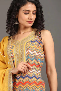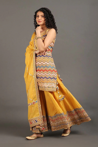 +Bring festive flair to your wardrobe with our Ratna Ghagra Set, crafted in soft, breathable cotton mulmul. The vibrant multicolored chevron-printed kurta is detailed with intricate gota work and side tassels, perfectly paired with a mustard yellow flared ghagra featuring a bold printed embellished border. A matching dupatta with gota highlights and chevron accents completes this lively ensemble—ideal for festive occasions, haldi function and joyful celebrations.