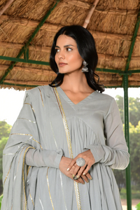 +This elegant sky grey suit set is crafted from airy, soft mulmul cotton for all-day comfort. It features a flowy Anarkali kurta with full sleeves, churidar bottoms and a delicately embellished dupatta with golden accents. A perfect blend of grace and breathability for festive or daytime occasions.
