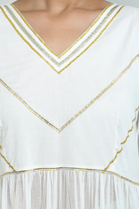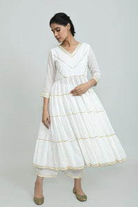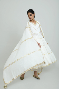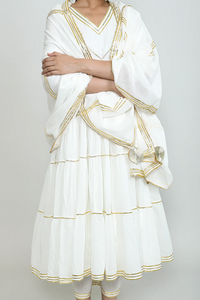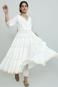+This elegant white kurta set is crafted from premium mulmul, offering unmatched softness and breathability. Featuring a tiered silhouette with intricate gota lace detailing on the neckline, sleeves and hem, it comes paired with palazzo pants for a graceful finish. Lightweight and festive, perfect for day functions and intimate celebrations.