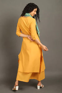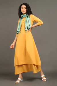 +This three-piece set features a high-low kurta set with a handkerchief silhouette, front placket with wooden buttons and three-quarter sleeves. It is paired with a sleeveless A-line inner longer than kurta giving it a layered look in matching fabric for effortless movement. The look is completed with a block-printed stole, detailed with tassel edging, perfect for everyday elegance with a touch of ethnic charm.