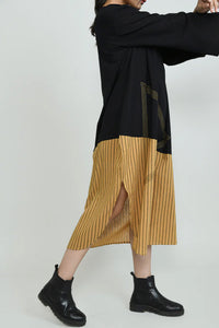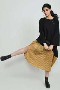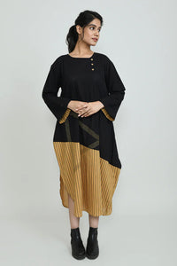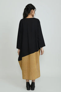 +Where earthy tradition meets modern geometry — the desert at night dress is an effortless ode to free-spirited structure. With a bold panel of vertical ochre stripes and abstract linear embroidery, this piece blends grounded hues with architectural flair for the contemporary bohemian soul.