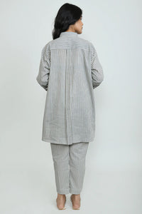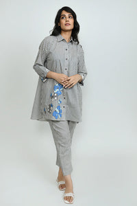 +This contemporary two-piece set features a stylish collared shirt in a classic grey and white vertical stripe pattern, enhanced with beautiful blue and grey floral patchwork on the front left and a subtle blue accent on the cuff. It is perfectly complemented by comfortable straight-leg trousers in a matching grey and white stripe design. This ensemble offers a modern and chic aesthetic, blending timeless stripes with elegant floral details for a cohesive and sophisticated look.