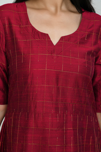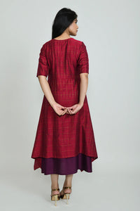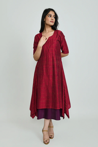 +Elegant and edgy, this ruby dress in premium cotton-silk features subtle gold stripes and a flattering asymmetric hem. The half sleeves and notch neckline add to its modern appeal, while the contrast purple inner layer brings depth and drama. Lightweight, breathable and perfect for festive evenings.