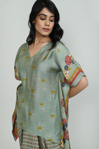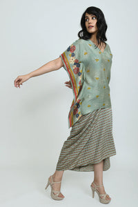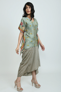 +This unique two-piece ensemble features a sophisticated sage green kaftan top adorned with subtle self-print motifs. It is beautifully paired with a modern draped dhoti-style skirt in a contrasting yet complementary geometric pattern of grey, red and white. This outfit perfectly blends traditional artistry with contemporary design, making it an ideal choice for a distinctive and elegant look.