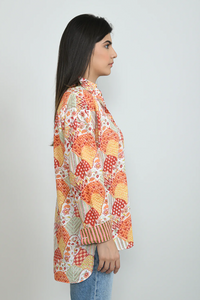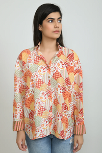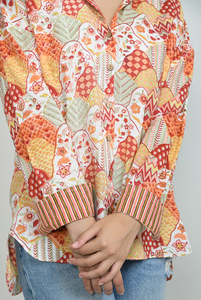 +Featuring a print of florals, leaves and geometric patterns in warm tones of orange, red and soft green, this shirt blends contemporary and traditional charm. Crafted from lightweight cotton with a relaxed fit and striped inner cuffs, this piece is perfect for casual days or dressed-up evenings.