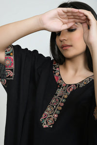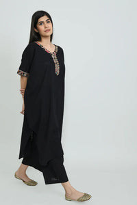 +Embrace timeless elegance with the black falls kurta Set. This black ensemble features intricate multicolour ethnic embroidery on the neckline and sleeve cuffs. The relaxed silhouette paired with straight pants offers unmatched comfort and understated sophistication. A perfect fusion of tradition and modern minimalism. Ideal for festive evenings and cultural gatherings.