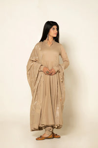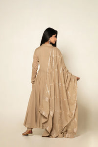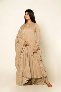 +Maintain a cut from the rest by wearing this long anarkali fully lined kurta, made in pure mulmul. The look is completed with an always in fashion churidar and dupatta adorned with beautiful gota jaal all over.